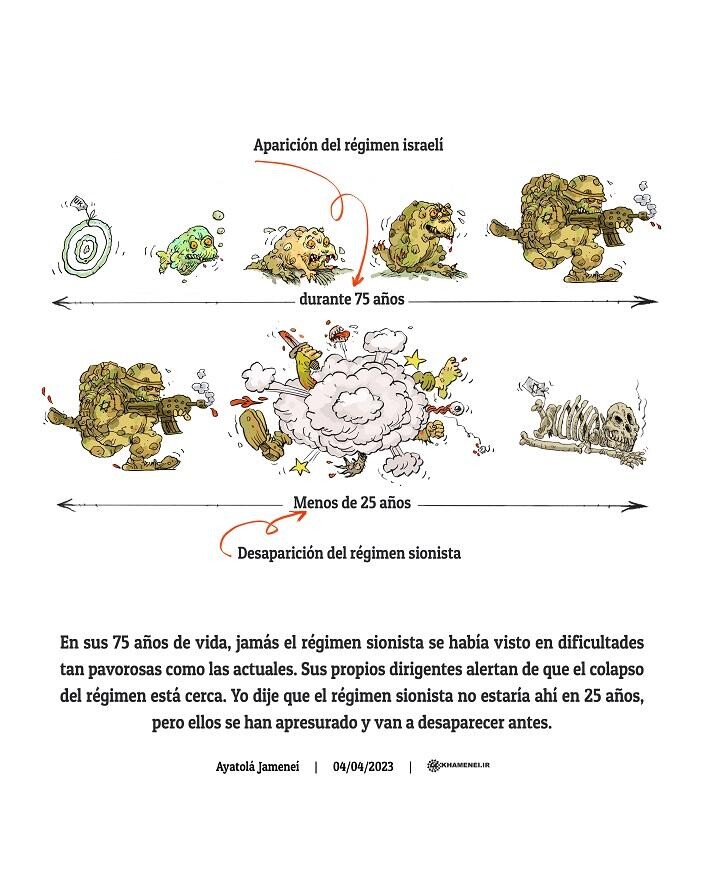 «En sus 75 años de vida, jamás el régimen sionista se había visto en dificultades tan pavorosas como las actuales. Sus propios dirigentes alertan de que el colapso del régimen está cerca. Yo dije que el régimen sionista no estaría ahí en 25 años, pero ellos se han apresurado y van a desaparecer antes».